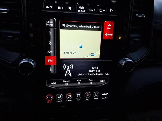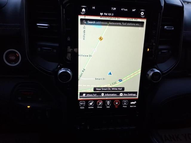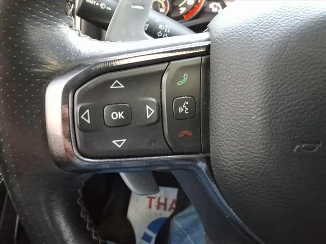 See what's behind you with the back up camera on the vehicle. Apple CarPlay: Seamless smartphone integration for the Ram 1500 - stay connected and entertained on the go! This unit offers Android Auto for seamless smartphone integration. This vehicle is a certified CARFAX 1-owner. An off-road package is installed on this Ram 1500 so you are ready for your four-wheeling best. Lane Keep Assist in this unit helps maintain safe driving by gently steering to stay within the lane. Start this vehicle from inside with remote start. Our dealership has already run the CARFAX report and it is clean. A clean CARFAX is a great asset for resale value in the future. This unit features a hands-free Bluetooth® phone system. The installed navigation system will keep you on the right path. The Ram 1500 is pure luxury with a heated steering wheel. This model has automated speed control that adjusts to maintain a safe following distance, enhancing highway driving convenience.